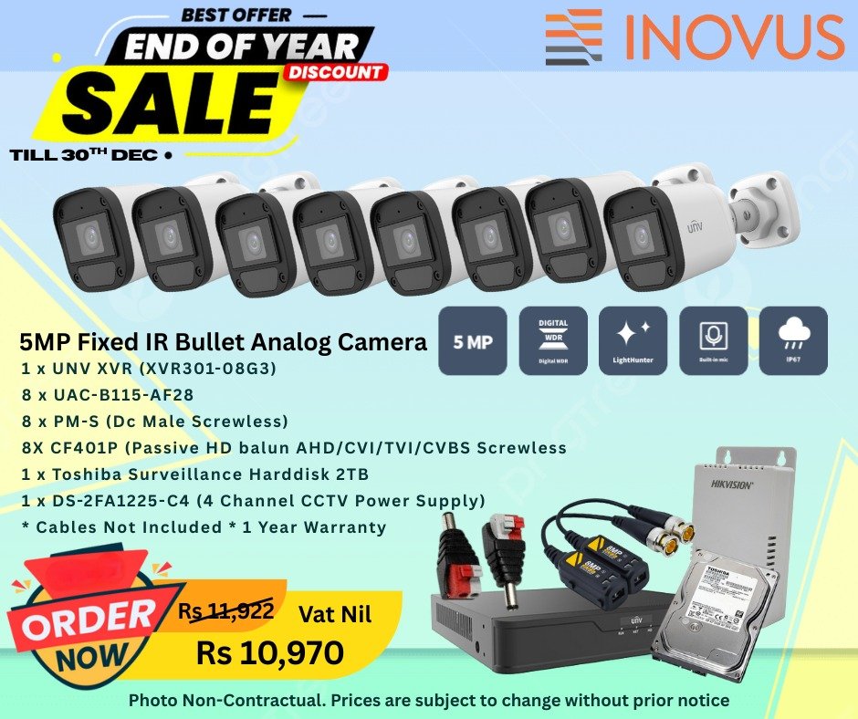 UNV 5MP IR Mini Bullet Analog Camera + UNV XVR 8-ch + DC Male Screwless + 8MP Passive HD Transceiver + Toshiba 2TB Hard Disk + 4 Channel CCTV Power Supply