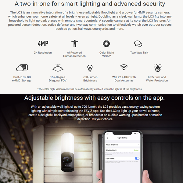 The LC3 is an innovative integration of a brightness-adjustable floodlight and a powerful 4MP security camera, which enhances your home safety at all levels – even at night. Doubling as a sleek wall lamp, the LC3 fits into any household to light up dark places with remote smart controls. A security camera at its core, the LC3 features AI-powered person detection, active defense, and two-way communication to effectively watch over outdoor spaces such as patios, hallways, courtyards, and more.