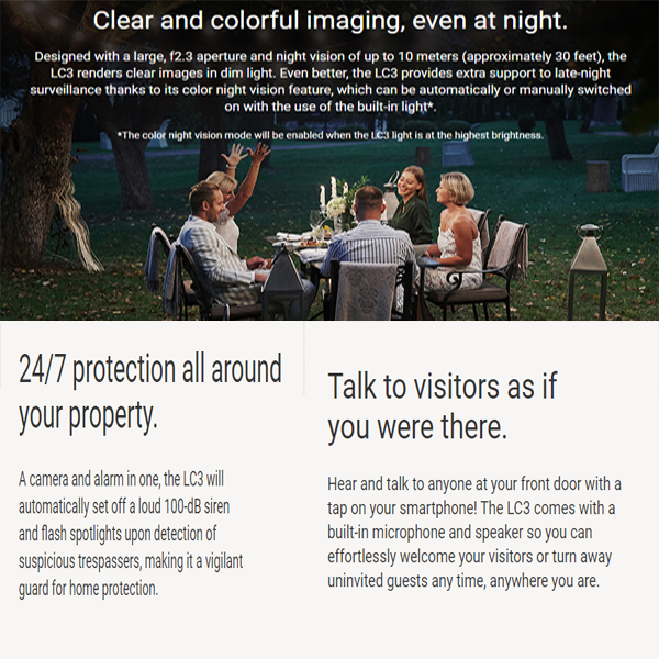 A camera and alarm in one, the LC3 will automatically set off a loud 100-dB siren and flash spotlights upon detection of suspicious trespassers, making it a vigilant guard for home protection.